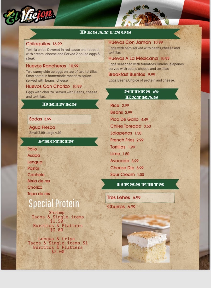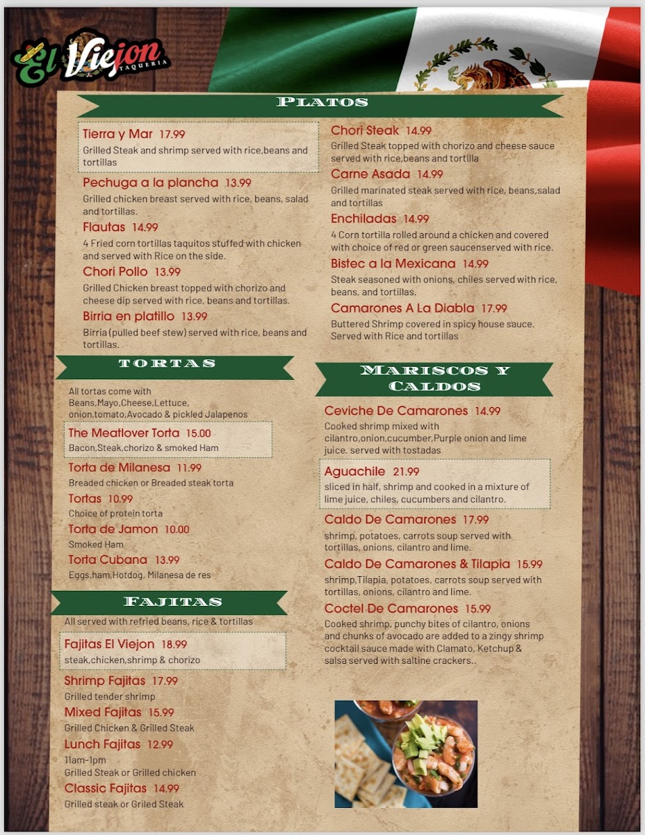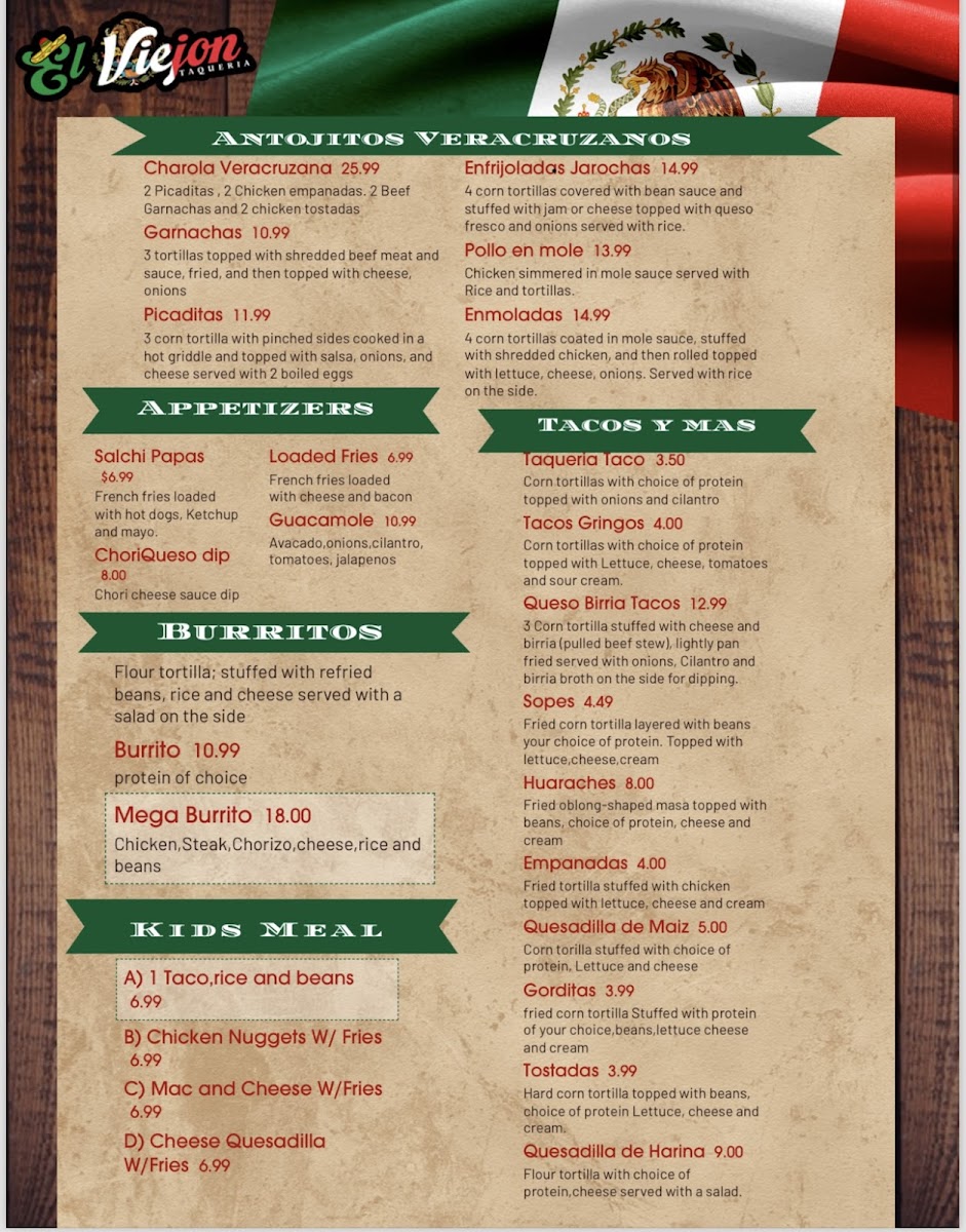 Taqueria El Viejon in Norfolk, VA, offers an authentic Mexican dining experience that stands out with its fresh, flavorful dishes and inviting atmosphere. The menu showcases traditional Veracruzanas favorites like Charola Veracruzana, Enfrijoladas Jarochas, and rich Pollo en Mole, each crafted with care and vibrant Mexican flavors. Burrito lovers will appreciate the choice between a classic burrito and the generously sized Mega Burrito, while taco enthusiasts can indulge in specialties such as Taqueria Tacos, the popular Queso Birria Tacos, and various antojitos like sopes, huaraches, and garnachas.